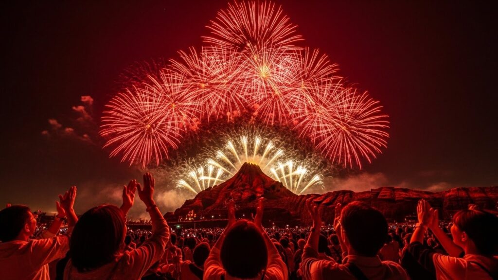 そして、カウントダウンと共に、夜空に盛大な花火が打ち上がります。 マグマの赤を基調とした、ダイナミックな花火。 地響きのような音と、視界を覆い尽くす光のシャワー。