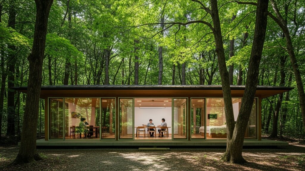 閉鎖的な空間では、思考も閉塞します。 そのため、当施設の会議室は、全面ガラス張りで森と一体化するように設計されています。 目に入るのは緑、聞こえるのは鳥の声。 例えば、行き詰まったらテラスに出て深呼吸をするだけで、脳に酸素が行き渡り、新たな視点が降りてきます。 言い換えれば、自然のエネルギーを借りて、思考の壁を突破するのです。