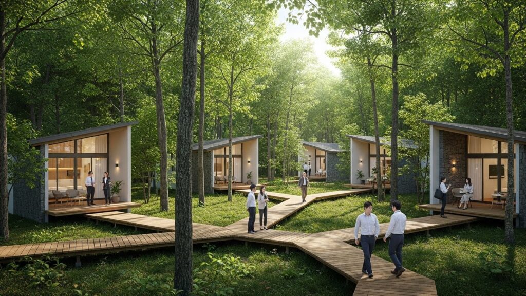 加えて、特定のチームで篭って作業をする場合です。 事実、森の中に点在する独立型コテージを、サテライトオフィスとして活用します。 誰にも邪魔されない静寂と、すぐに議論できるホワイトボード。 煮詰まったらサウナへ直行。 これこそが、生産性を極限まで高める、クリエイターやエンジニアにとっての理想の作業場です。