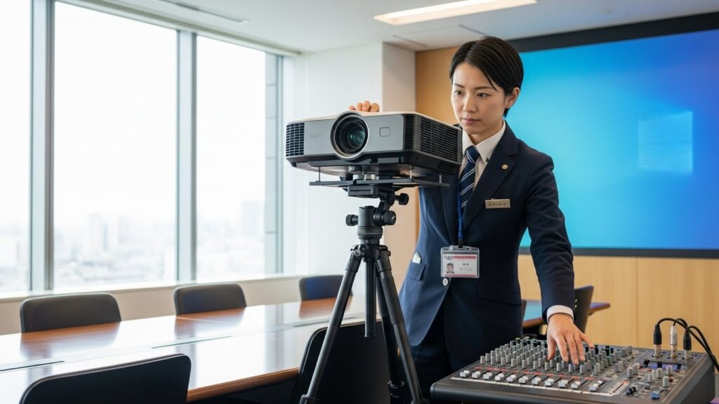 - マイクや映像機器の接続チェック、ハイブリッド開催時の配信設定もサポートします。