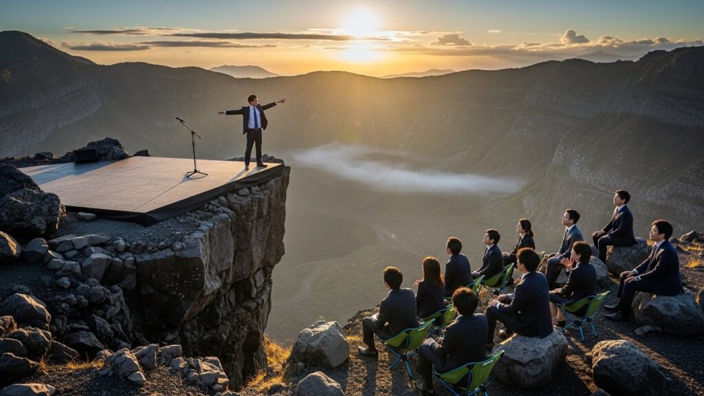 リーダーが指差す先には、スクリーンではなく、本物の世界が広がっています。 風が吹き抜け、雲が流れる。 このスケール感(サブライム)の中に身を置くと、人間は細かい懸念や不安を忘れ、未来への希望にフォーカスするようになります。