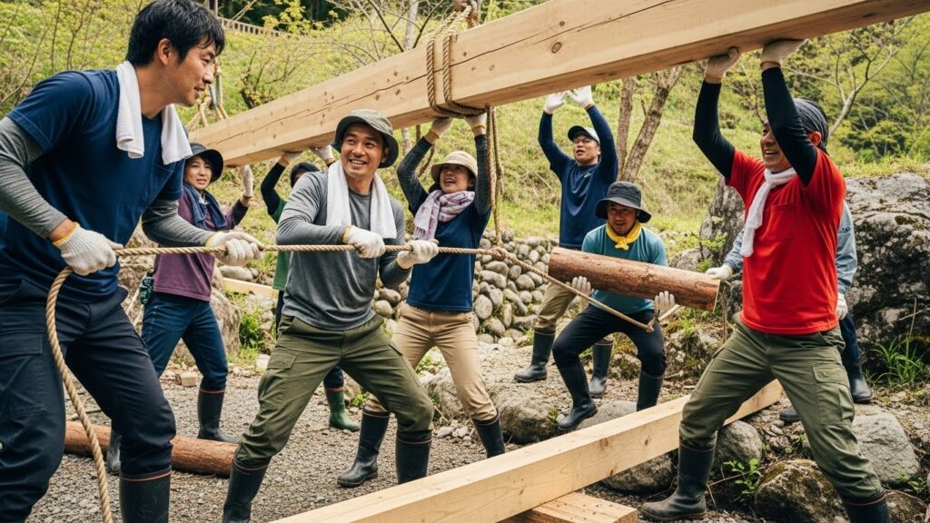 「この谷を渡るための橋を、全員で架けてください」 象徴的な儀式ではなく、物理的な共同作業を行います。 重い木材を運び、ロープで結び、不安定な足場を固定する。