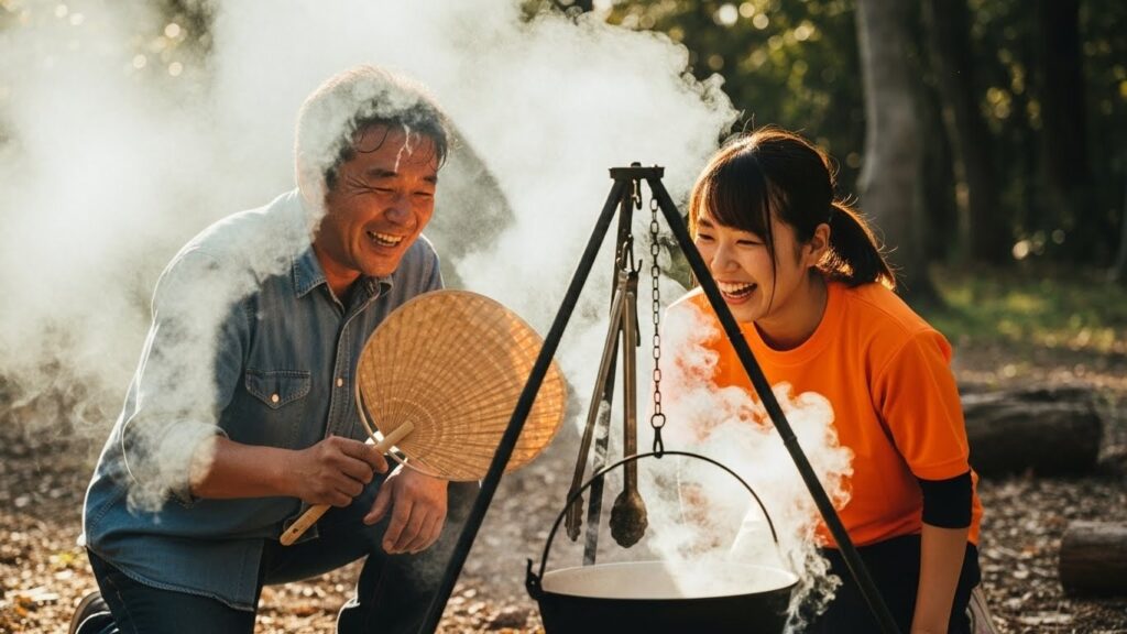 「〇〇部長、火起こし上手いですね! かっこいい!」 「君の包丁さばき、すごいな。料理するのか?」
