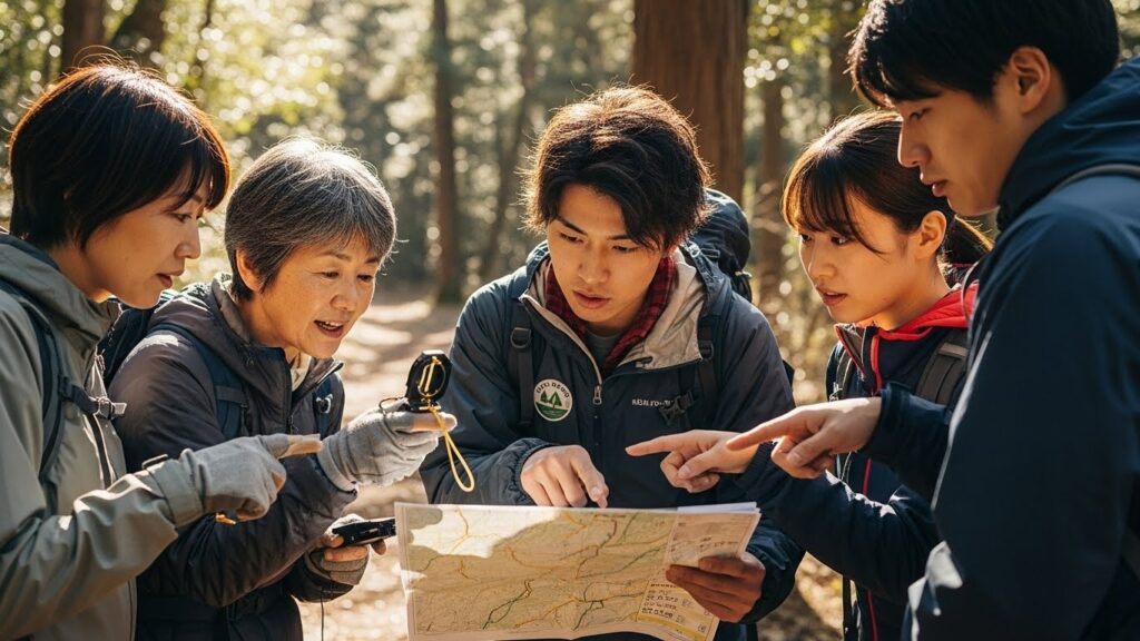 「山頂のポイントは高得点だけど、時間がかかるぞ」 「部長は膝が悪いから、平地ルートを中心に攻めましょう」 「私は地図が読めるので、ルート案内します!」