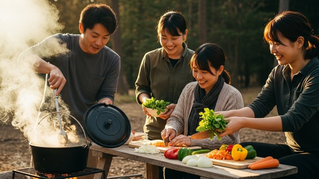 初めての共同作業。 料理が得意な人が指揮を執り、力持ちが薪を割り、几帳面な人が野菜を切る。