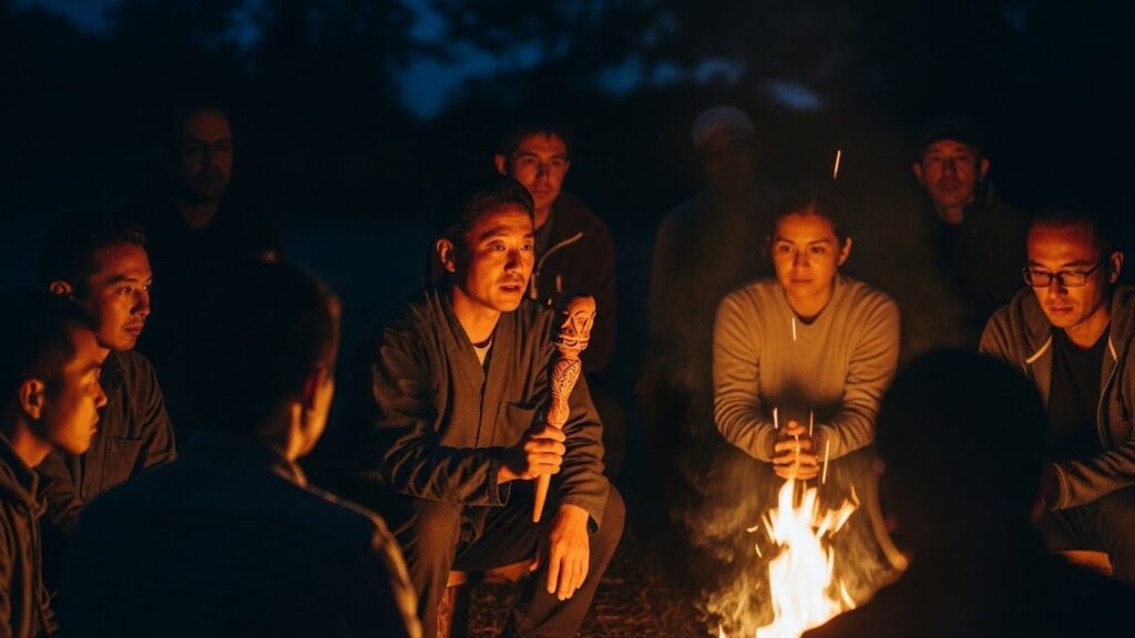 夜、満天の星空の下で焚き火を囲みます。 これは、単なるキャンプファイアーではありません。組織の深層心理にアクセスするための「儀式」です。 炎のゆらぎを見つめていると、人は自然とトランス状態(変性意識状態)に入り、普段は意識の底に沈めている本音や感情が浮上してきます。